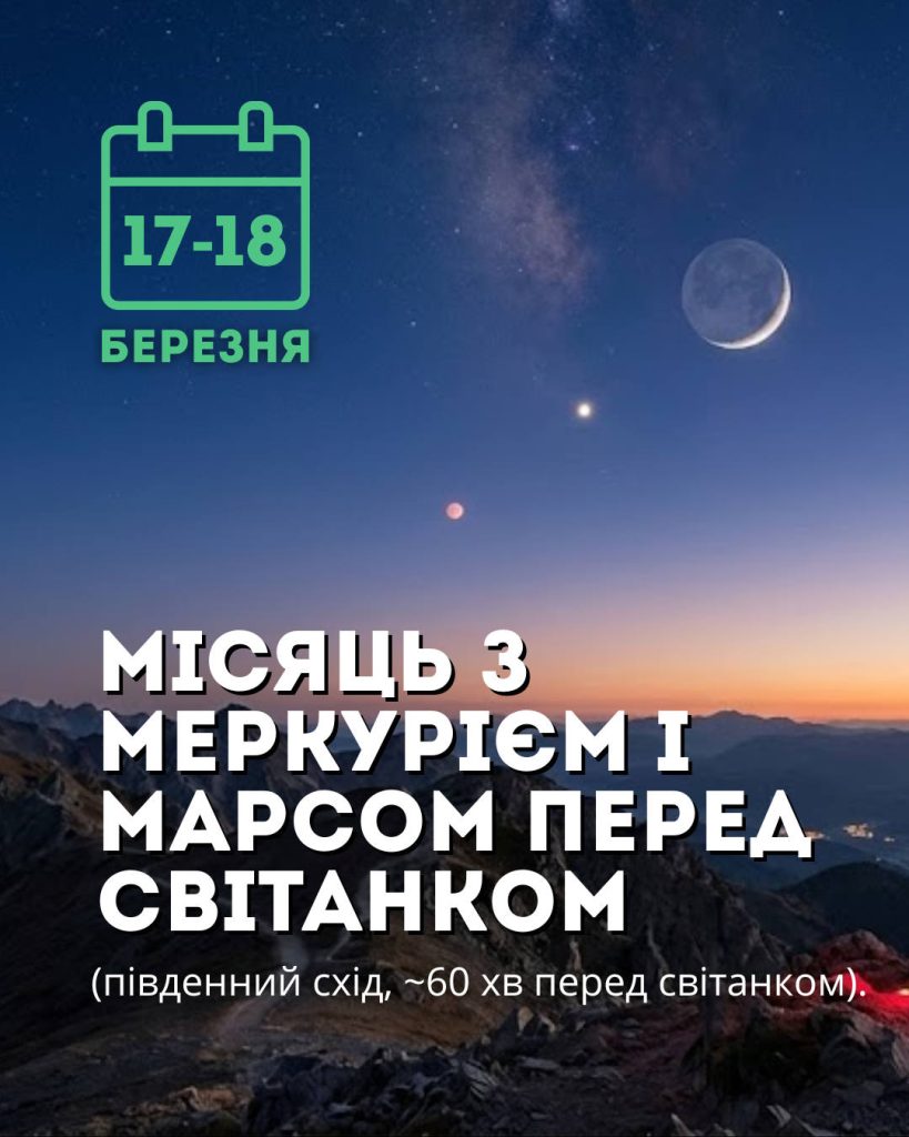 • 17-18 березня цікаві для тих, хто встає до світанку: приблизно за 60 хвилин до сходу Сонця на південному сході можна буде спостерігати Місяць, Меркурій і Марс, що вишикуються в лінію;