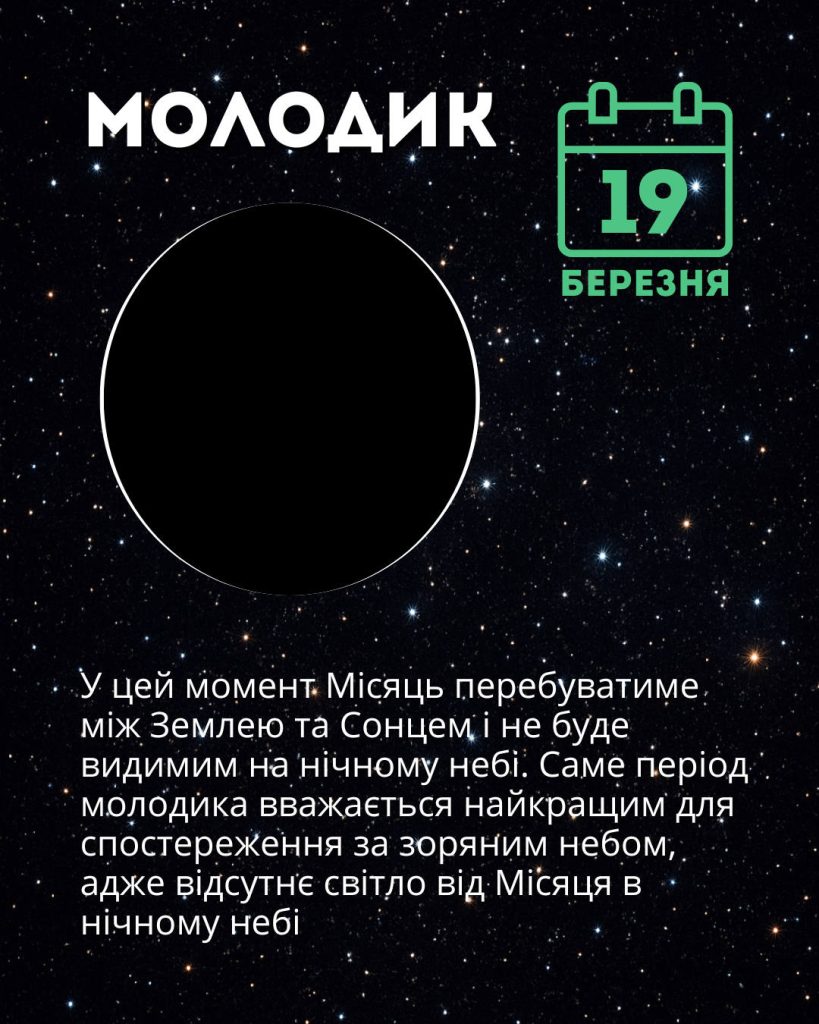 • 19 березня з неба “зникне” Місяць – супутник сховається між Землею та Сонцем. Це ідеальний час, щоб спостерігати за зірками, адже світло від Місяця на “перебиває” їхнє свічення;