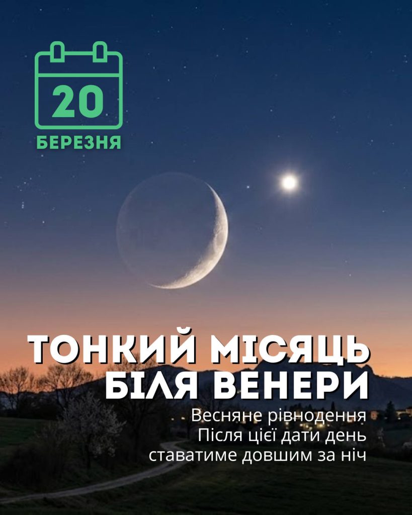 • 20 березня “новонароджений” місяць з’явиться в небі поряд із Венерою. Настане весняне рівнодення – нарешті день ставатиме довшим за ніч.