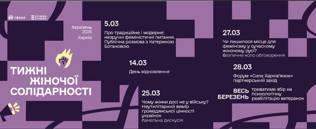 27.03 — «Чи лишилося місце для фемінізму у сучасному жіночому русі?» Безпечне коло для відкритої розмови про трансформацію жіночого руху під час війни. Серед учасниць дискусії: Ольга Ященко (Феміністична майстерня), Анастасія Герасименко (Марш жінок), Тетяна Чернецька (Центр гендерної культури), Анна Шаригіна (ХЖО «Сфера»), дослідниця Ганна Гриценко.